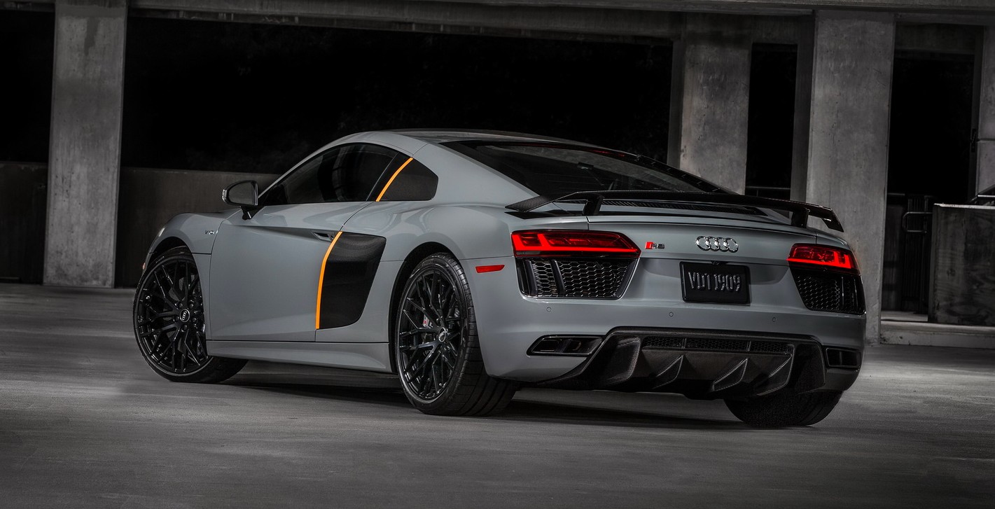 Besides its advanced headlight system, the special edition R8, which is limited to just 25 units, features an exclusive Quantum Gray paint, carbon fiber sideblade with Solar Orange stripe, and 20-inch wheels, joined by the carbon fiber diffuser, front lip spoiler, side mirror casings and fixed rear wing.