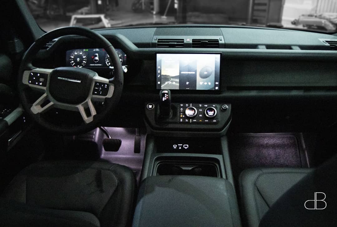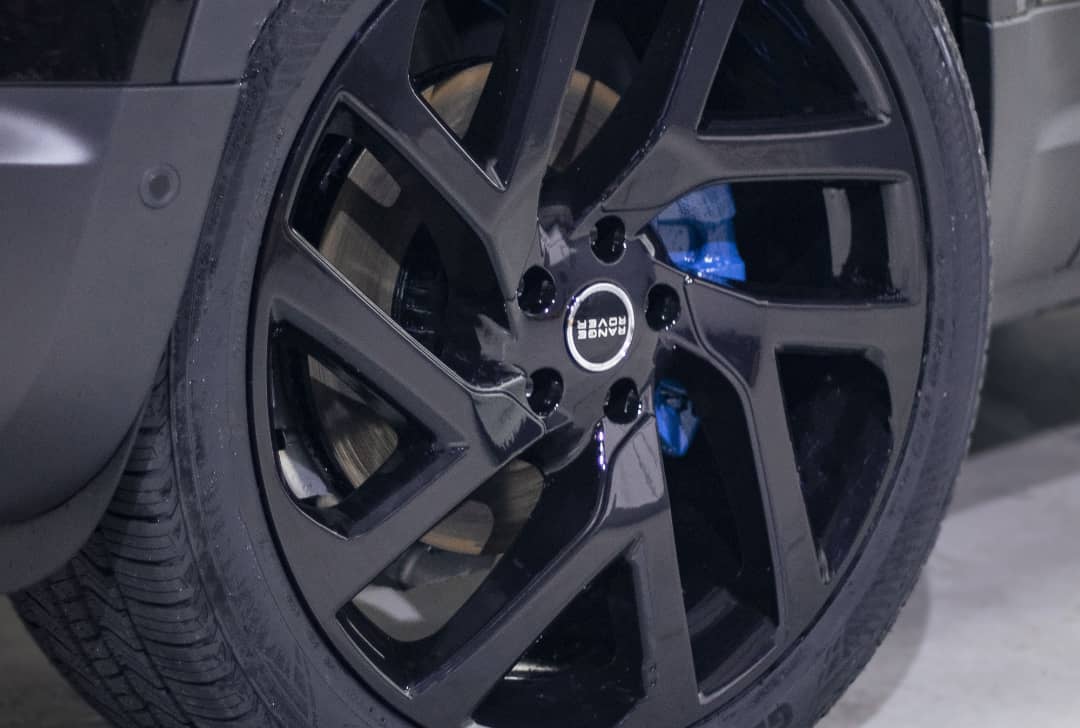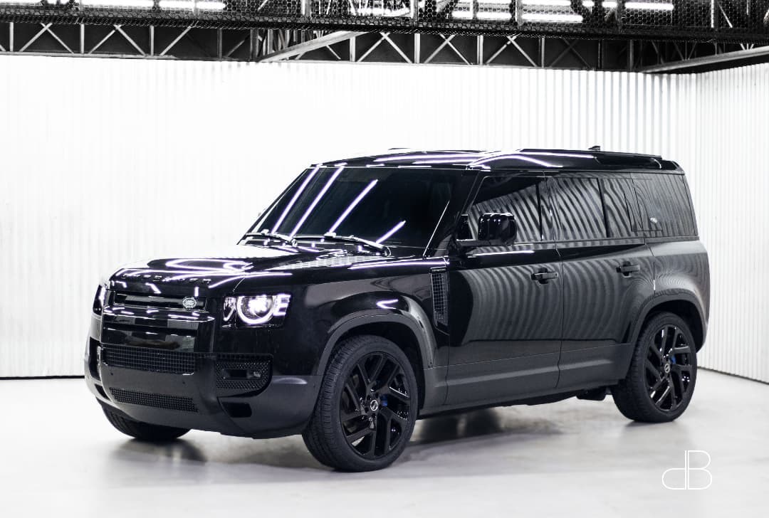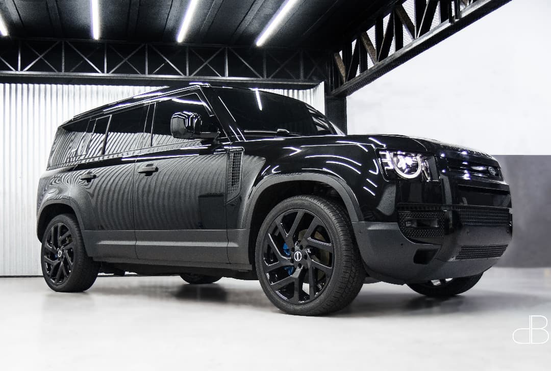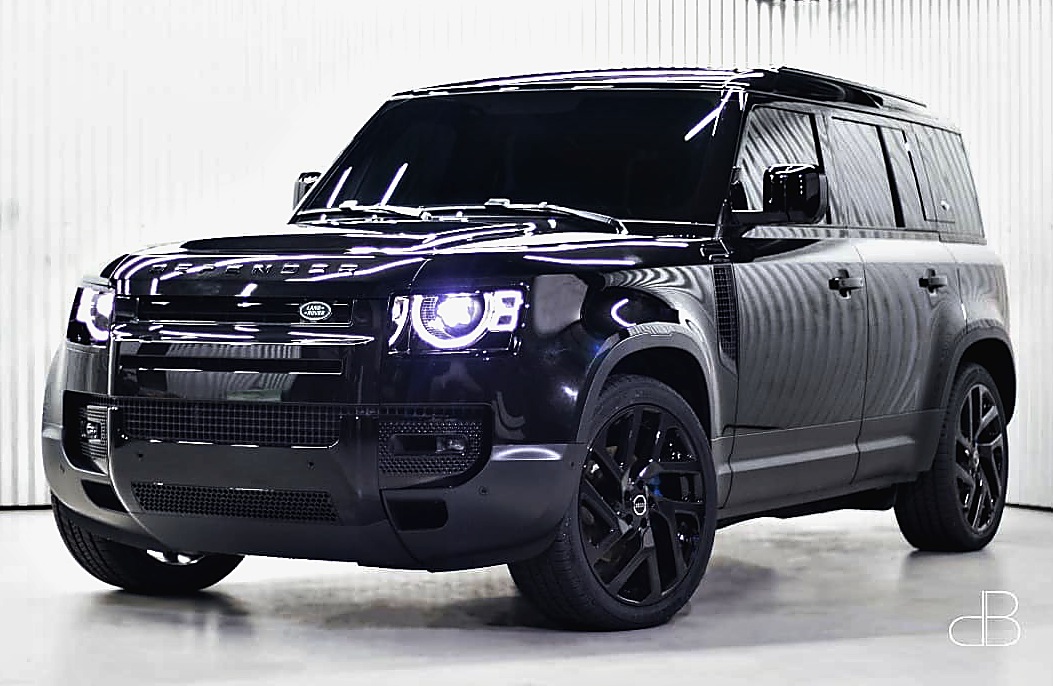 Full Black custom 2021 Land Rover Defender 110 by DB Sound, sitting on 22′ rims, painted calipers, wrapped in black to look like a Bond Edition.