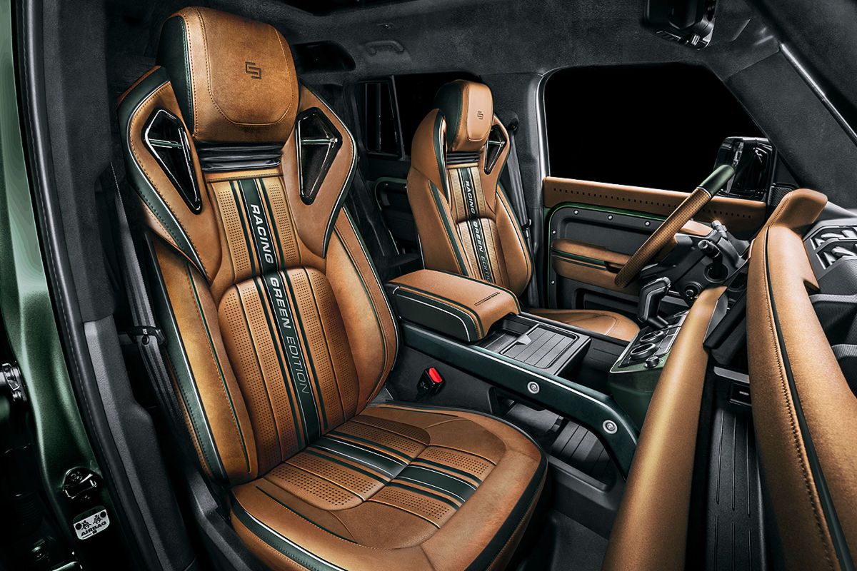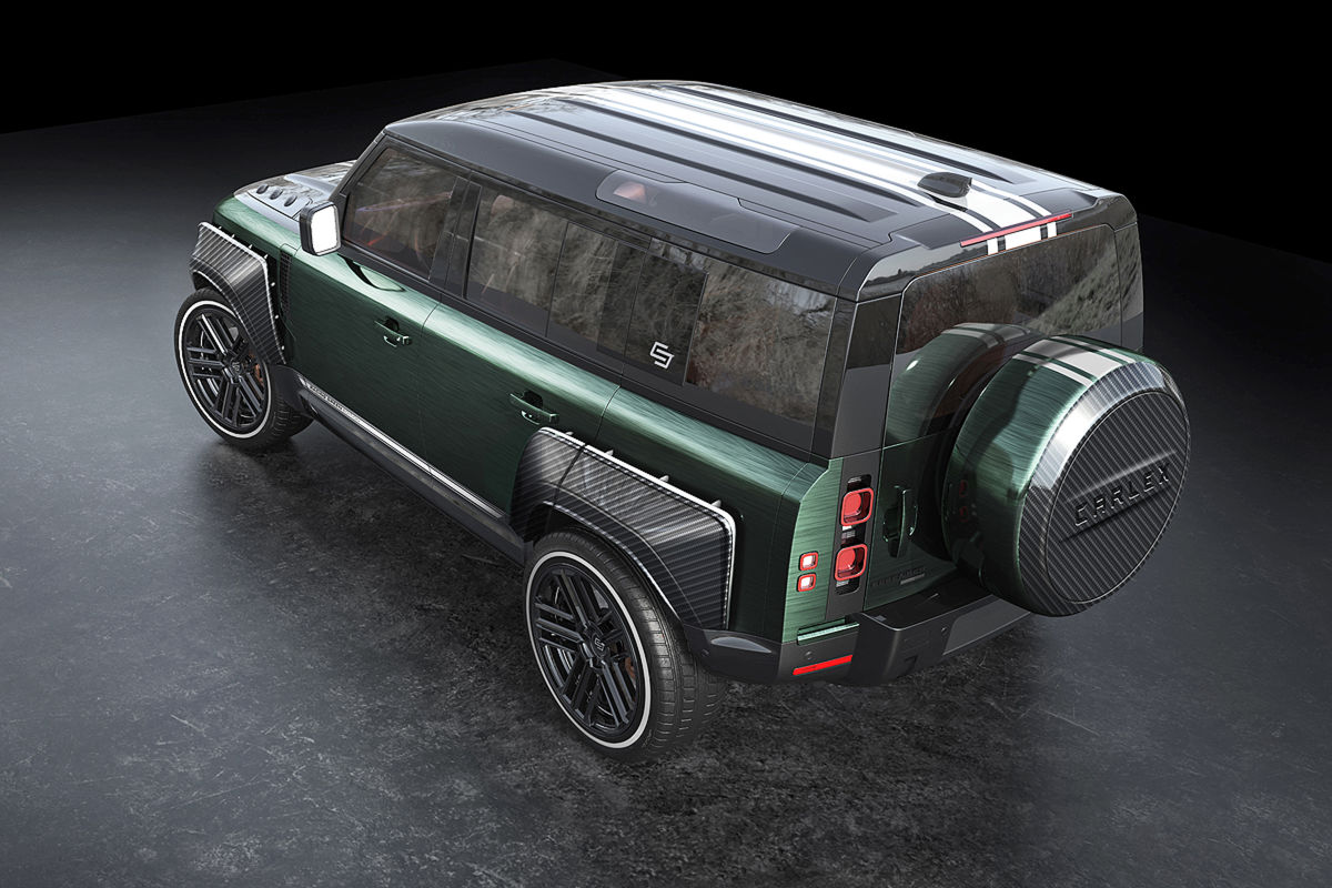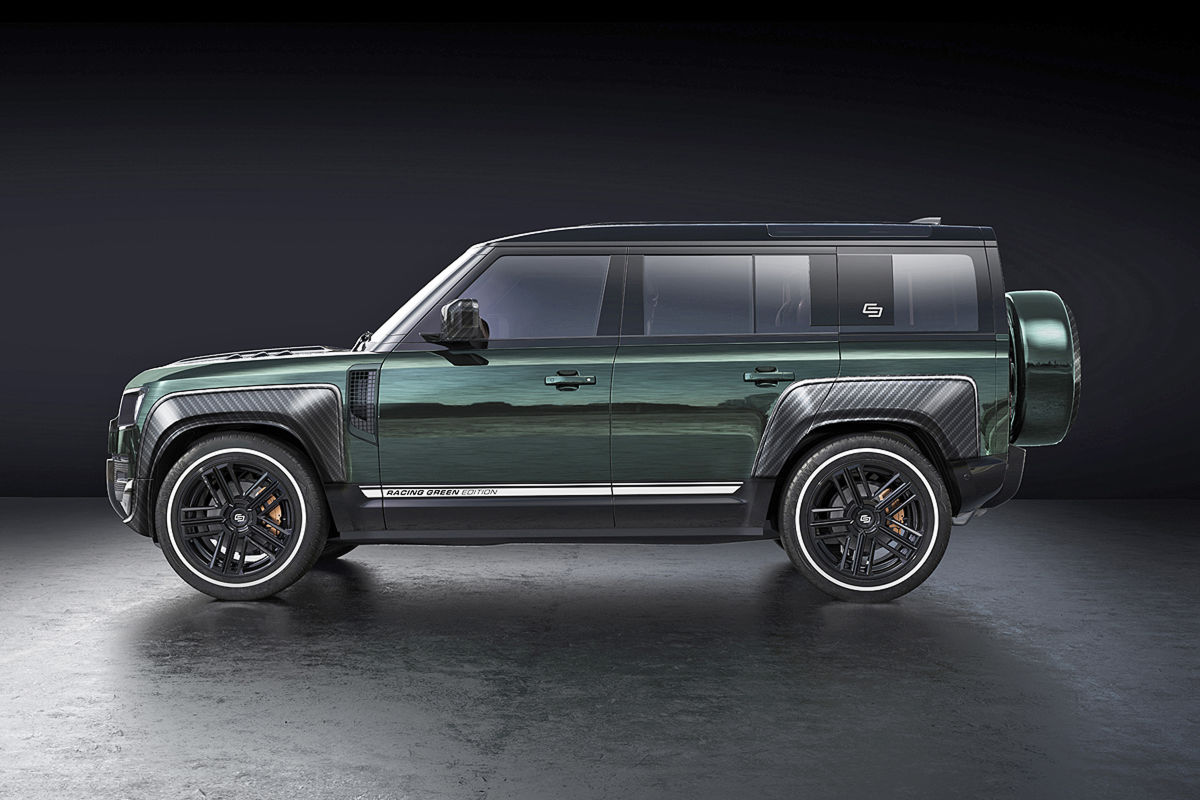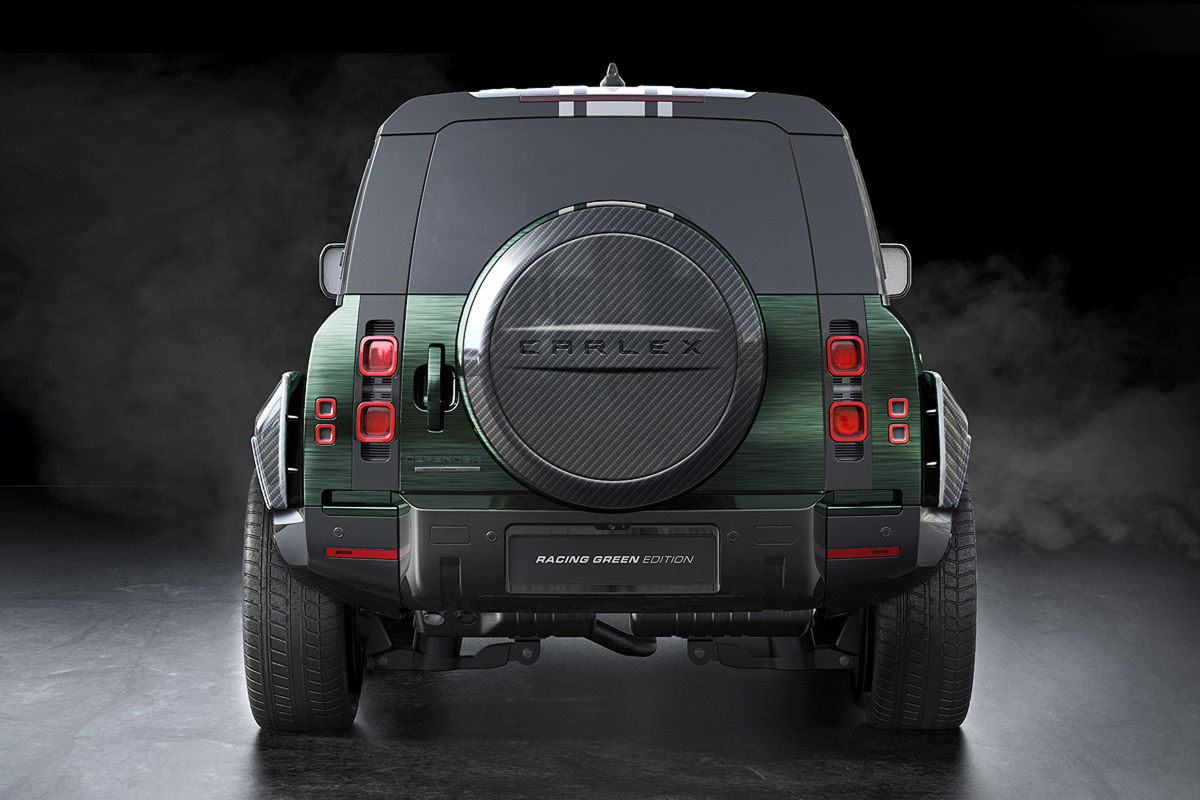 First off, the Defender is treated to a deep green paint finish inspired by the iconic British racing green, paired with hand painted porcelain white stripes that run nearly the entire length of the vehicle. Elsewhere, there are carbon-fibre wheel arch extensions to showcase the bespoke black wheels, and the material is also applied to the bonnet, side mirror caps as well as the spare wheel cover that sports an embossed “Carlex” script.