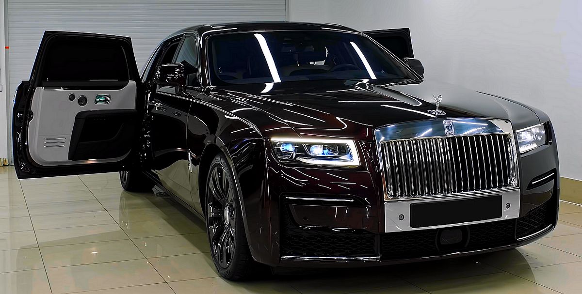 2021 Rolls-Royce Ghost Long, Engine: V12, 6.75 L, 571 Ps, 850 NM, 0-100 (km/h): 4.8 s, Top Speed: 250 km/h, Color: Bohemian Red. https://www.youtube.com/watch?v=5nX8ULSJfCE