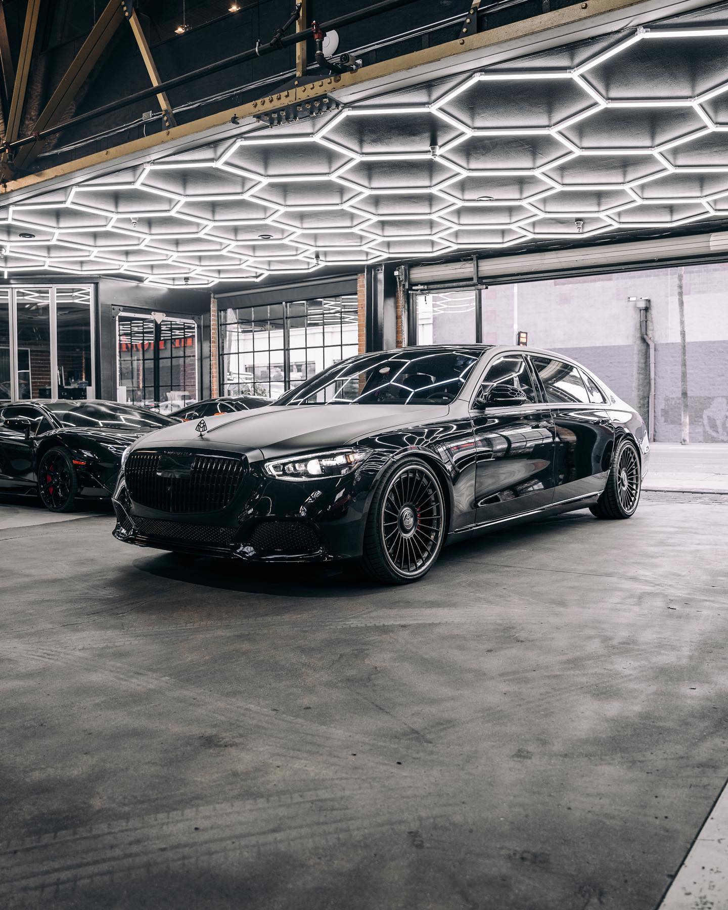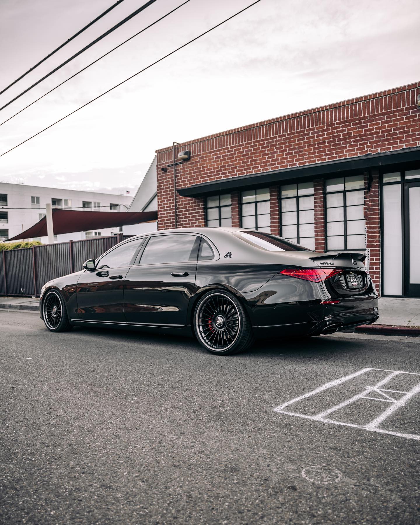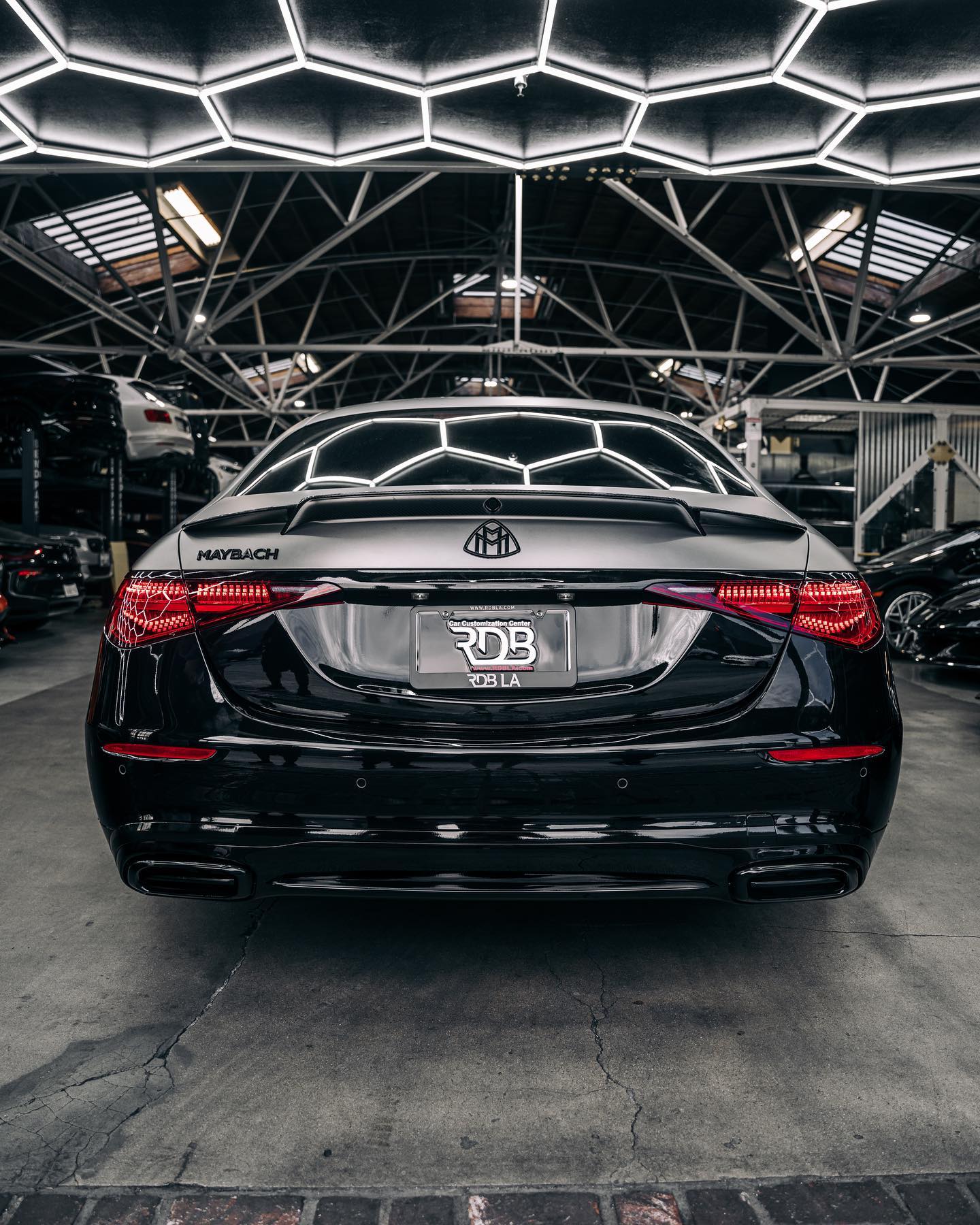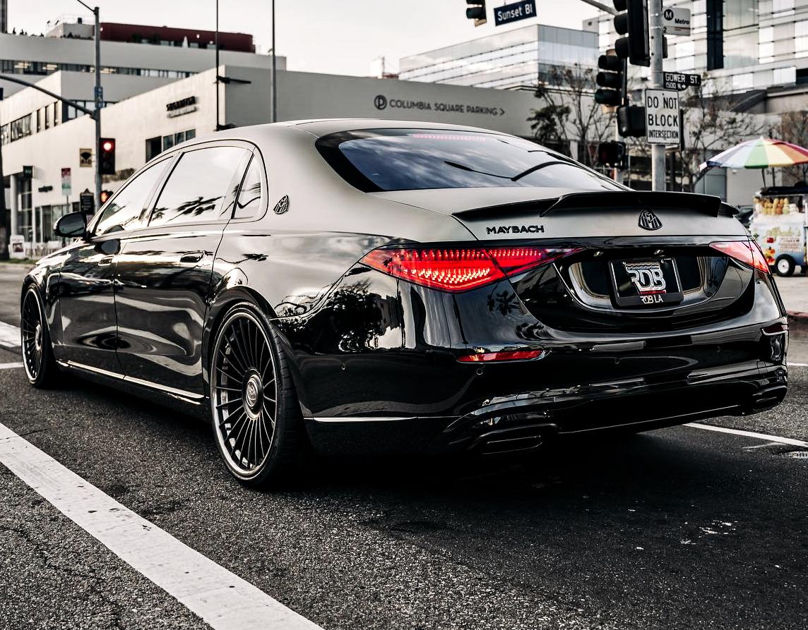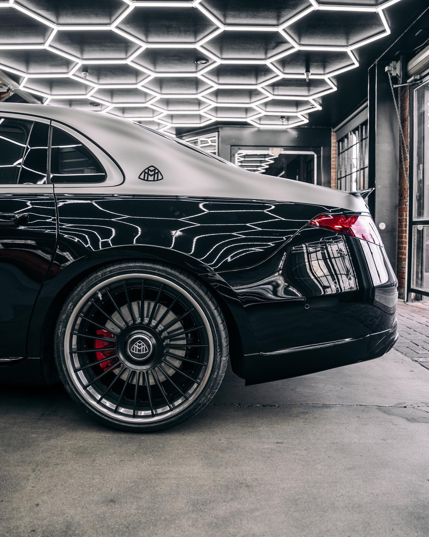 2022 Maybach in a “Titanium” Two Tone Finish, hexis Titanium Satin chrome Vinyl, Blackout Trims, @RDBwheels 22”, Maybach Light Up Emblems, Red calipers & BRABUS Trunk Spoiler.