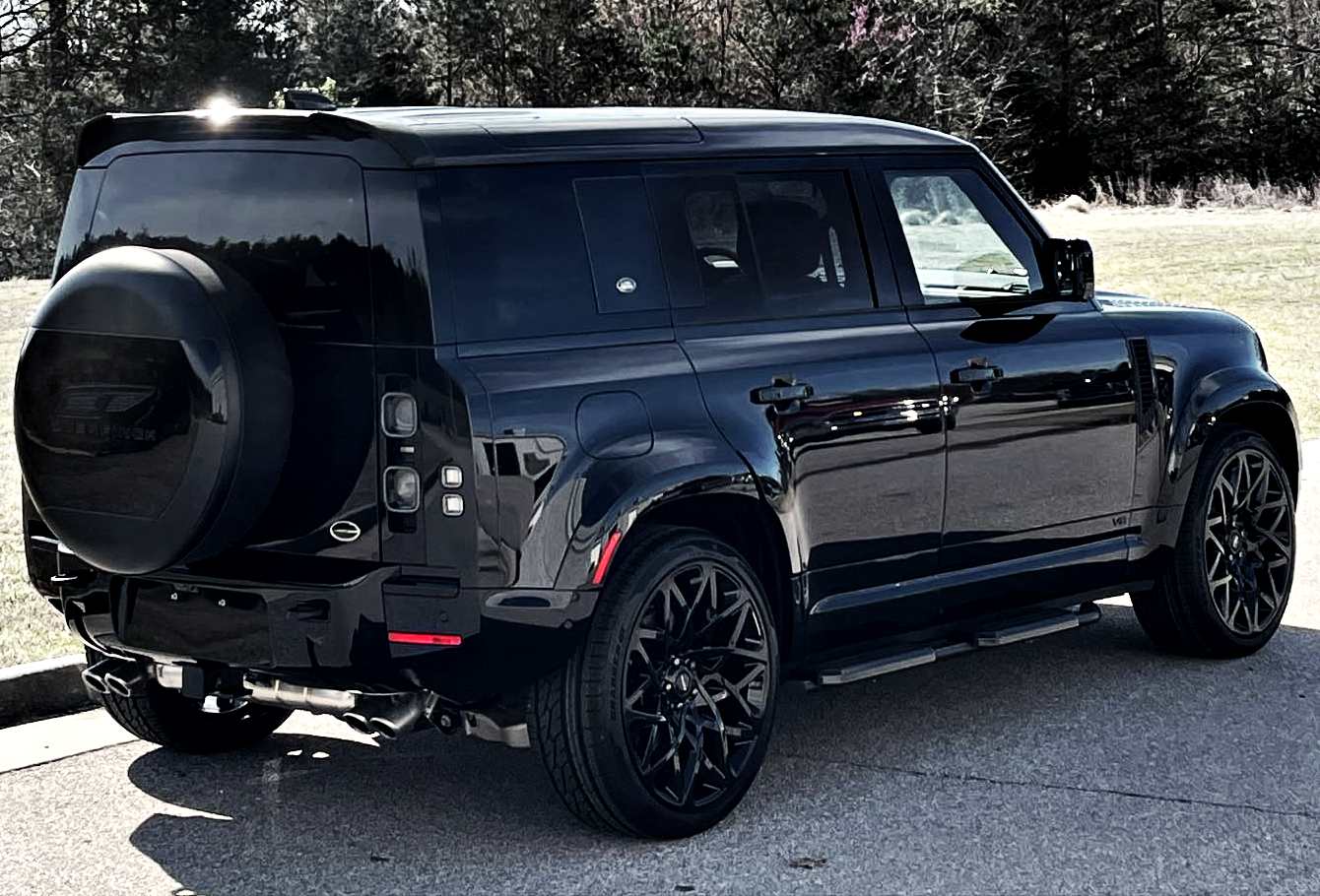 The Overfinch exterior conversion includes the Overfinch exterior color coding program, Overfinch rear top spoiler, Overfinch spare wheel cover, fixed side steps, Black Chrome with Sandblasted Inner Hood Lettering and the limited edition Overfinch Cyclone 23” Wheels in full gloss black over the Xenon blue front brake calipers.