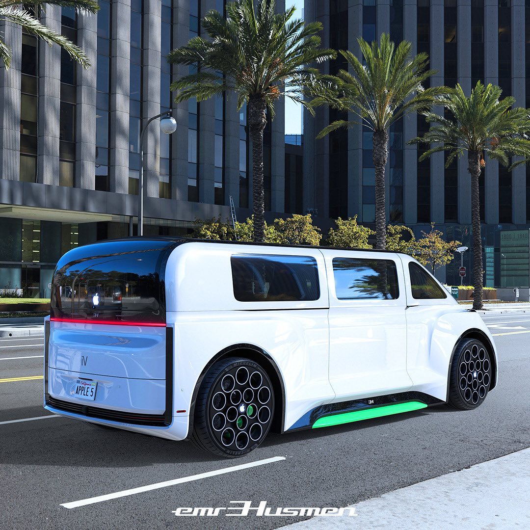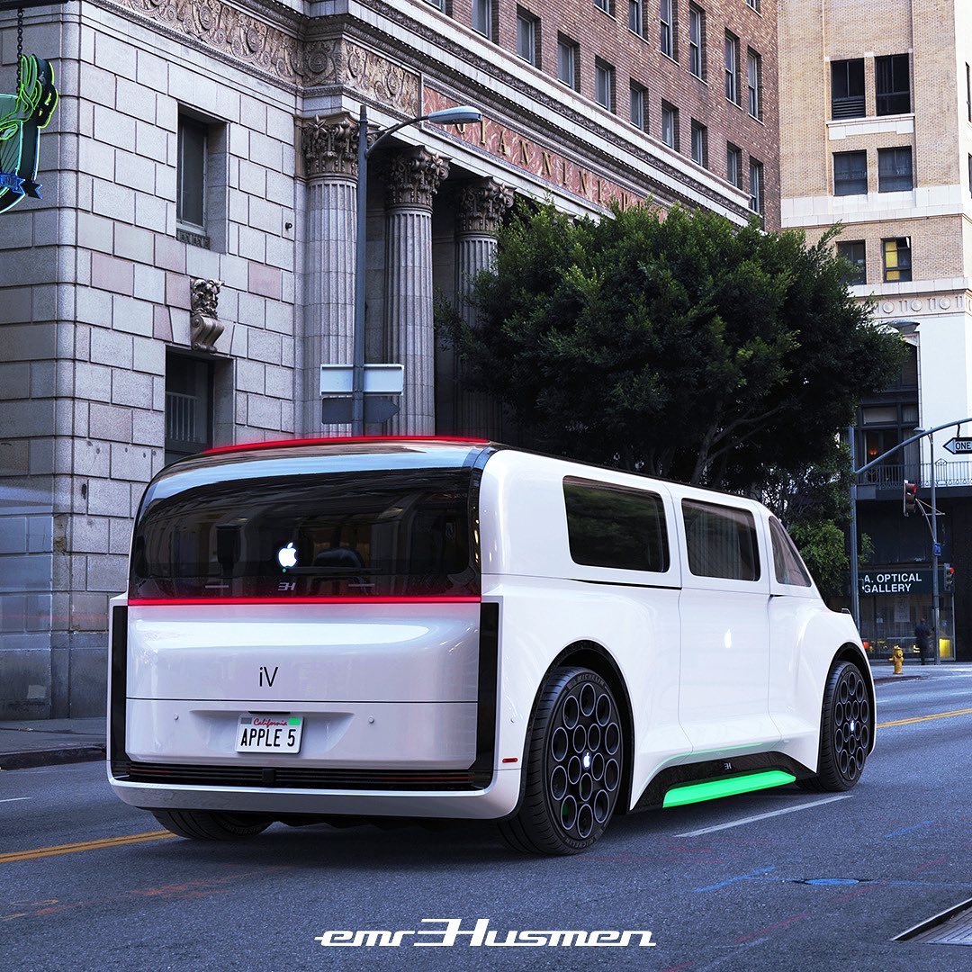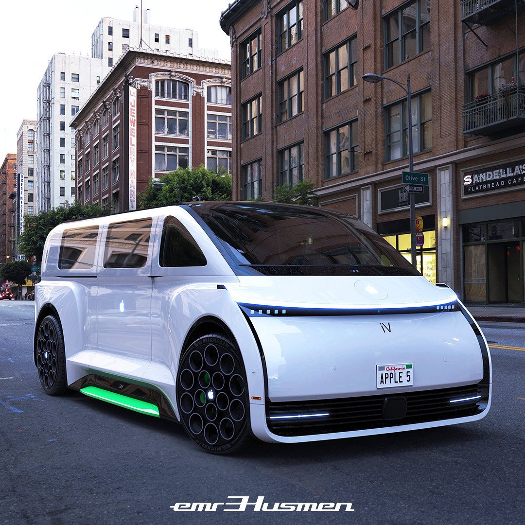 Apple iV concept by @emrEHusmen ® “iV (ai-vee) is my own concept design proposal for the long-awaited Apple car project. I imagined it as an electric “Van”, which is a 5m long, 1+2+2 personal living space. The steering wheel and the driver’s seat are placed in the centre of iV’s cabin, so it has a great visibility thanks to its large glasses. With advanced lidar and camera systems, it is able to transport its passengers fully autonomously. I applied “Apple styling” to its exterior design with respecting “golden ratios” in automotive design. 26″ wheels and large fenders give it a more sporty and suv-like look; height adjustable suspensions could be offered as an option.