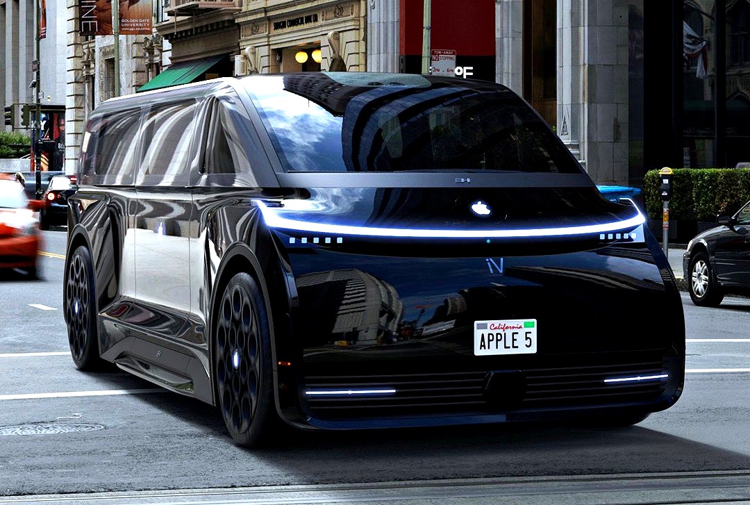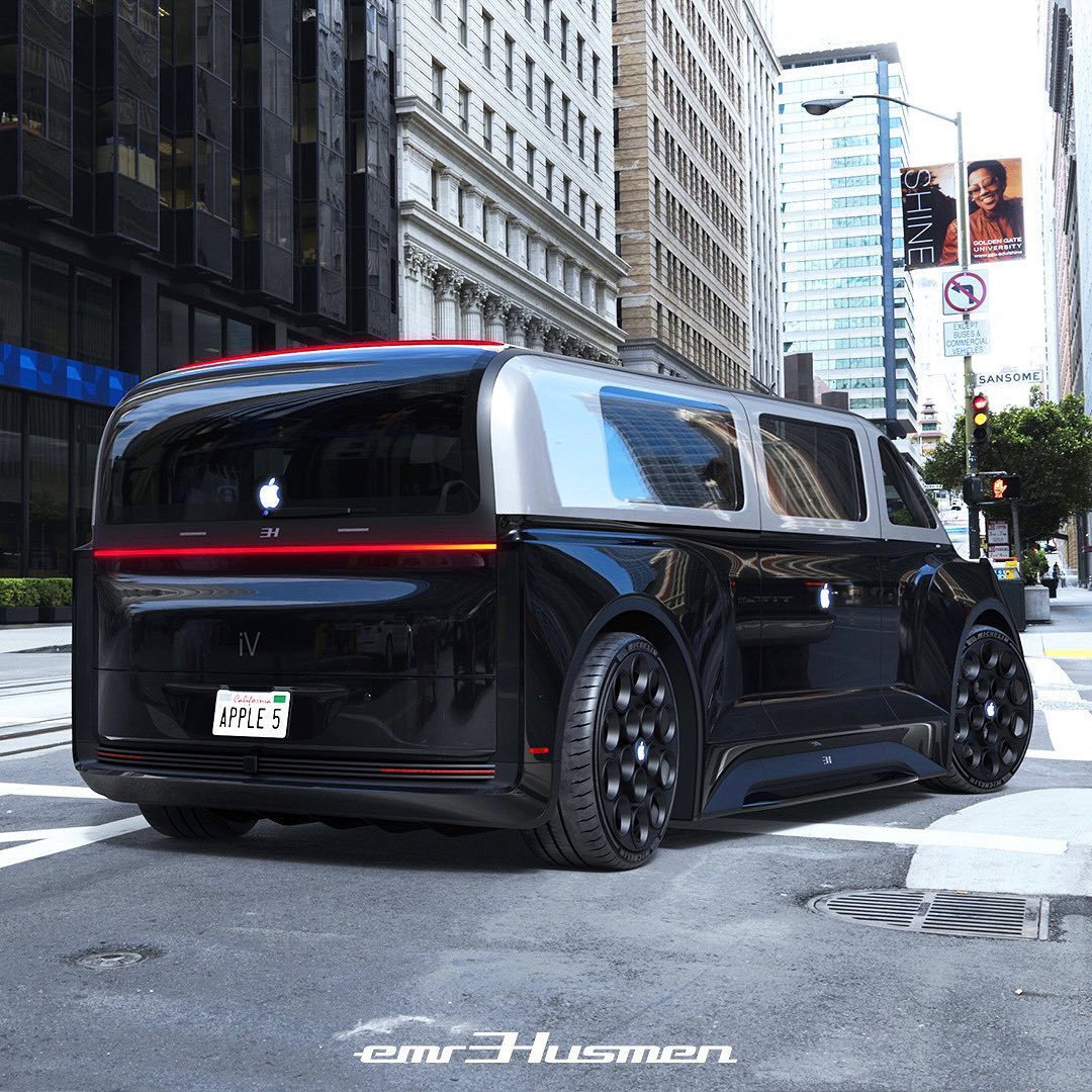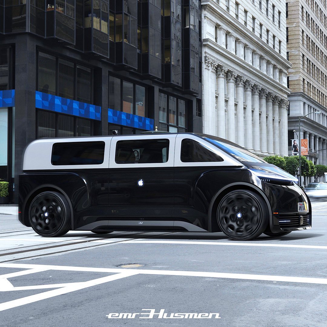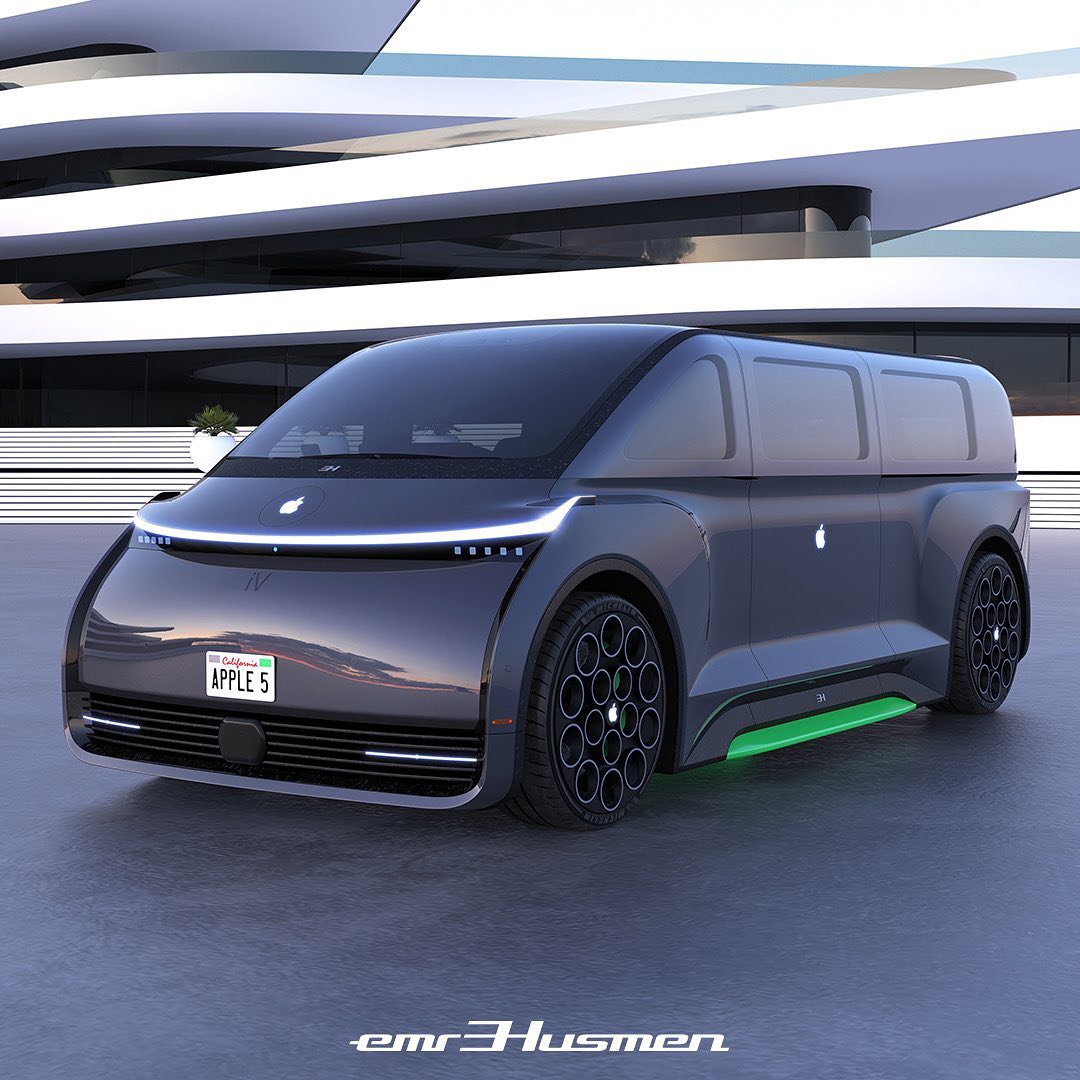 Apple iV concept by @emrEHusmen ® “iV (ai-vee) is my own concept design proposal for the long-awaited Apple car project. I imagined it as an electric “Van”, which is a 5m long, 1+2+2 personal living space. The steering wheel and the driver’s seat are placed in the centre of iV’s cabin, so it has a great visibility thanks to its large glasses. With advanced lidar and camera systems, it is able to transport its passengers fully autonomously. I applied “Apple styling” to its exterior design with respecting “golden ratios” in automotive design. 26″ wheels and large fenders give it a more sporty and suv-like look; height adjustable suspensions could be offered as an option.