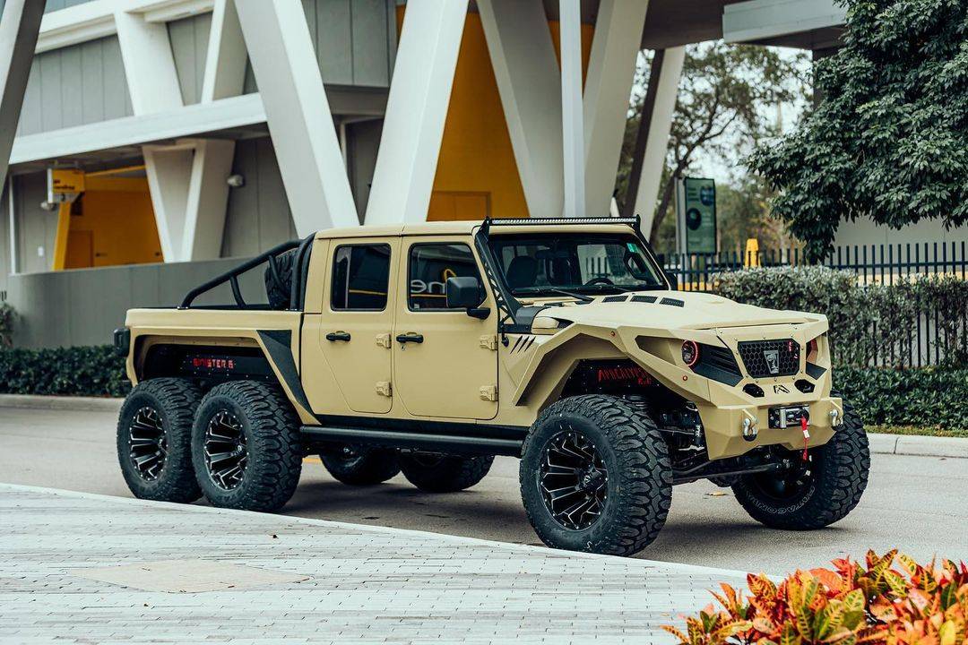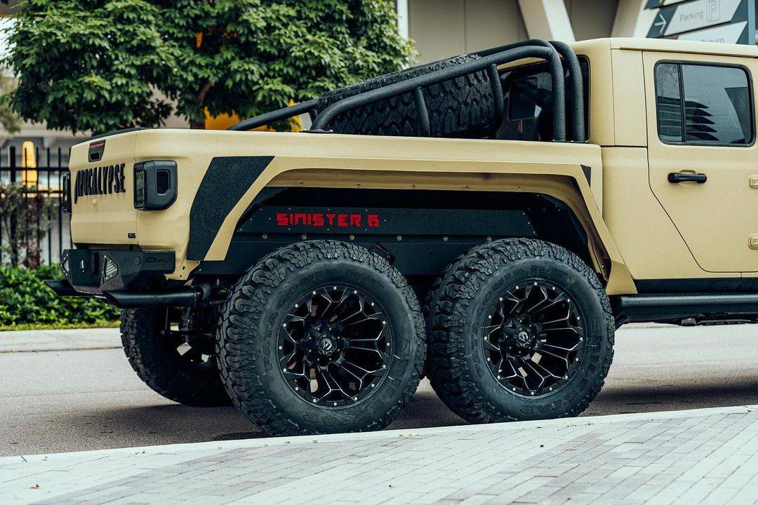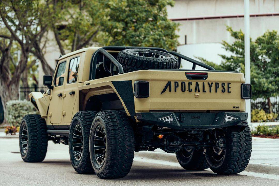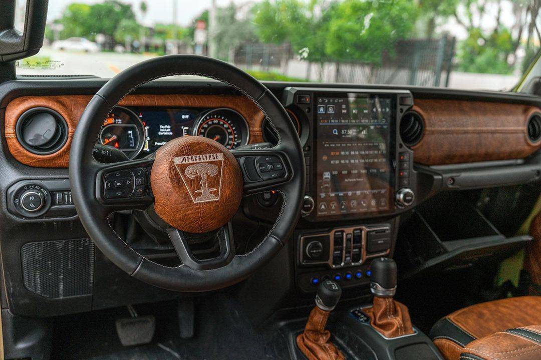 The Apocalypse Sinister six is a spirit that features 750 horses under its custom hood. Wrap around steel bumper, massive tires, fuelassault rims, handcrafted 7th tire carrier roll cage, 50” LED light bar and kevlar shell give its exterior that super predator look. The instead features door to ceiling marine grade weatherproof leather in a king ranch accent, while the 12” infotainment screen is bold.