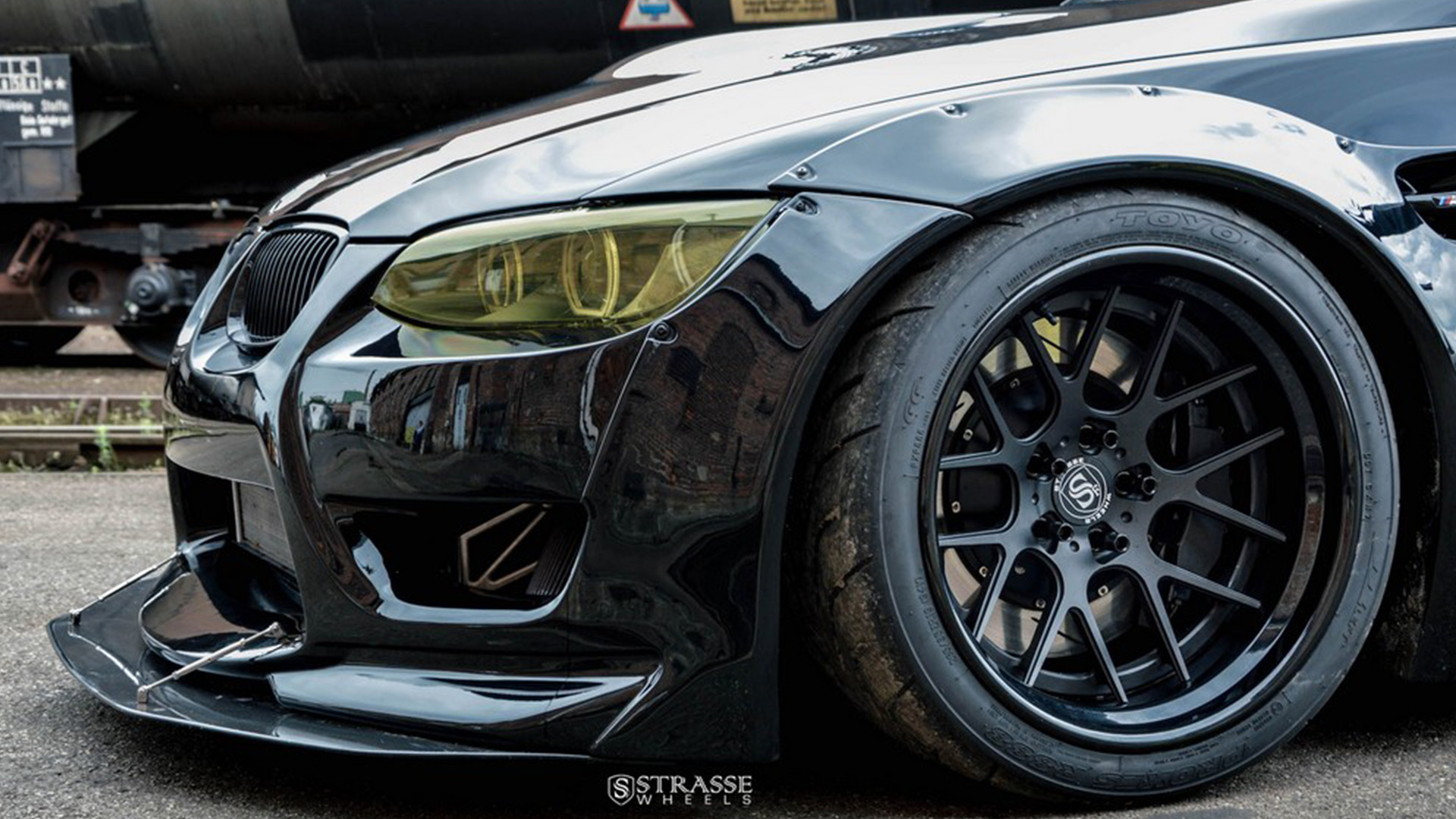 Liberty Walk presents a new modifications for the BMW M3 E92 while a new set by Strasse wheels with SM7 Deep Concave FS series wheels, measuring 19 x 10.5 in Front and 19 x 12 for the Rear finished in Matte Black Centers, Gloss Black Lips, Gloss Black Barrels finish wrapped in Toyo Proxes R888 street radial tires.