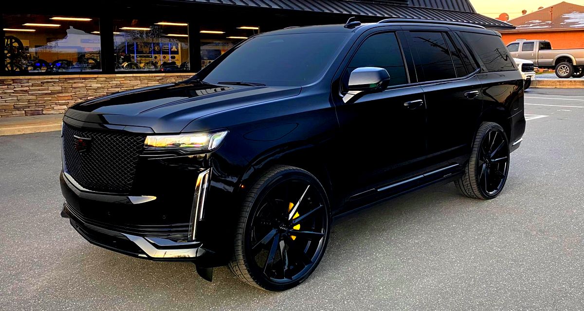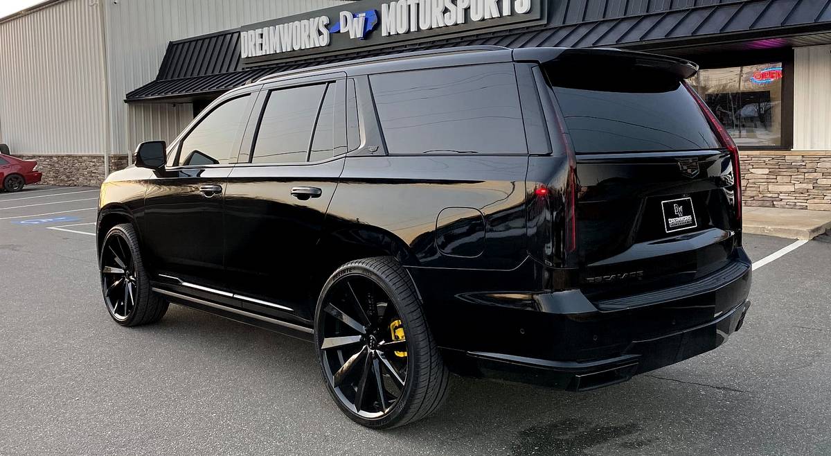 Murdered Out Cadillac Escalade for Greg Robinson of the Cleveland Browns. Dream Works Motorsports blacked out the whole truck, lowered, Suntek Films window tint, custom yellow accents and 26 “…