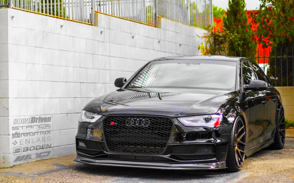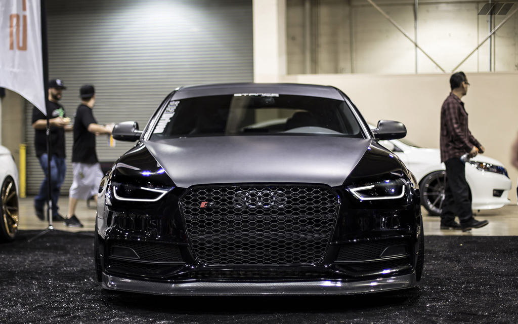 This is the crazy Audi Vader RS4, it got grill from ECS painted matte black and ghost Audi rings mounted behind the mesh. Headlights were baked open and painted matte black and the amber reflector was smoked…