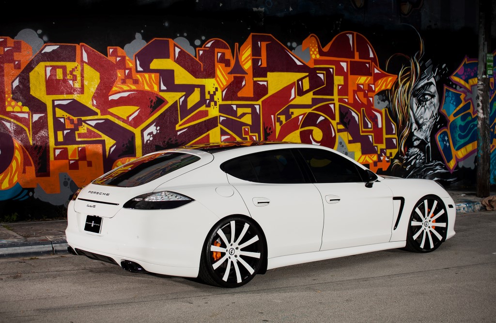Customized Porsche Panamera Turbo 4S By Exclusive Motoring, with color matched bumper trim, gloss black painted exterior accents, smoked lights,painted orange brake calipers, and lowered on color matched 22″ Forgiato wheels.