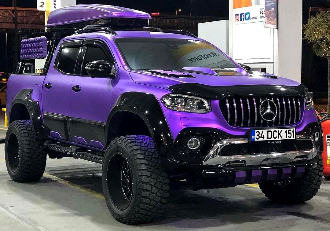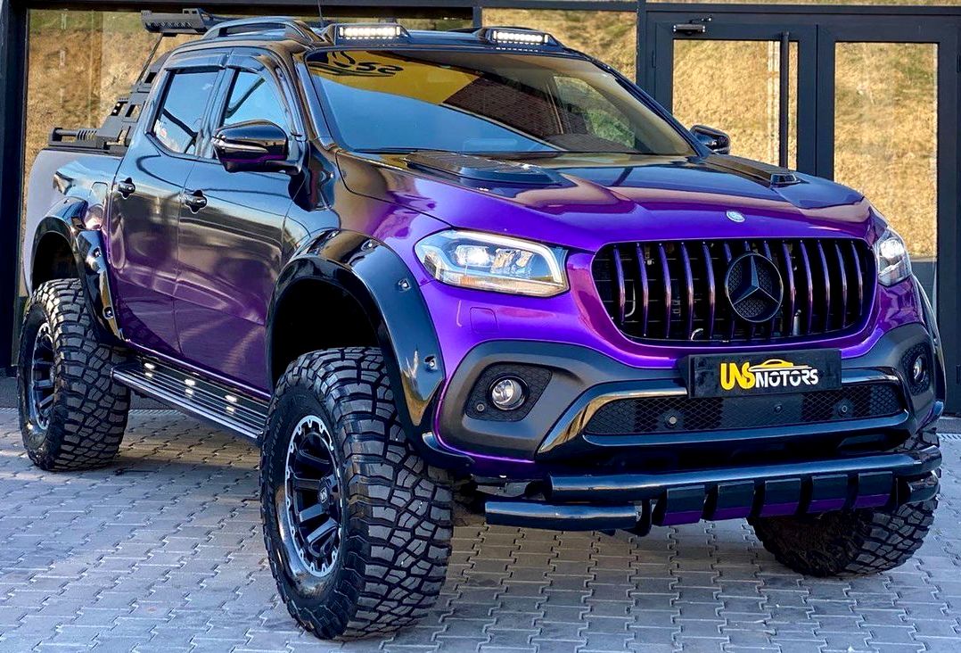 Mercedes X Class Carlex Exy Extreme + attracts attention with matte, carbon elements of the body kit. Massive Carlex Design Terrain sills, Line-X® coating, roof housing with Lazer lamps and StyleBar Extreme load box overlay create a coherent and strong look of the vehicle. The off-road character of the giant is emphasized by the satin paintwork of the body and energetic graphic styling.