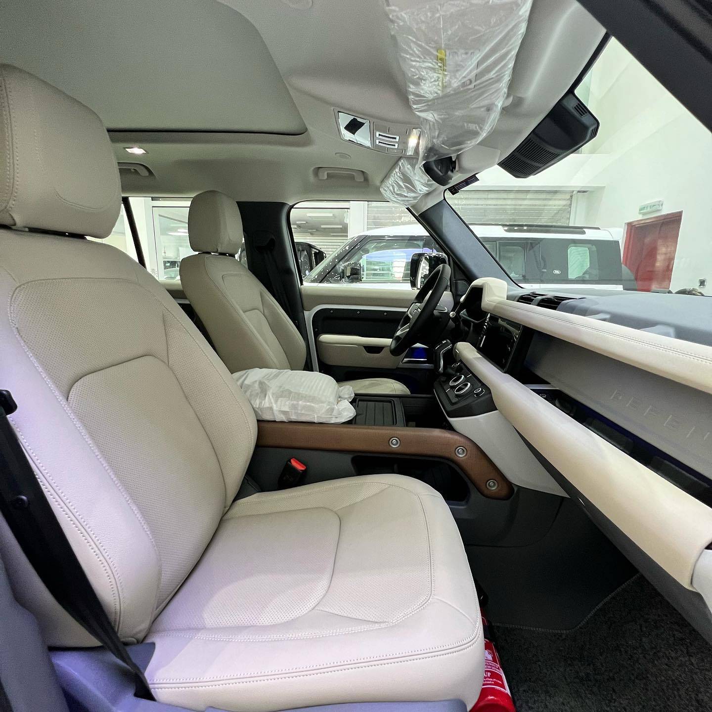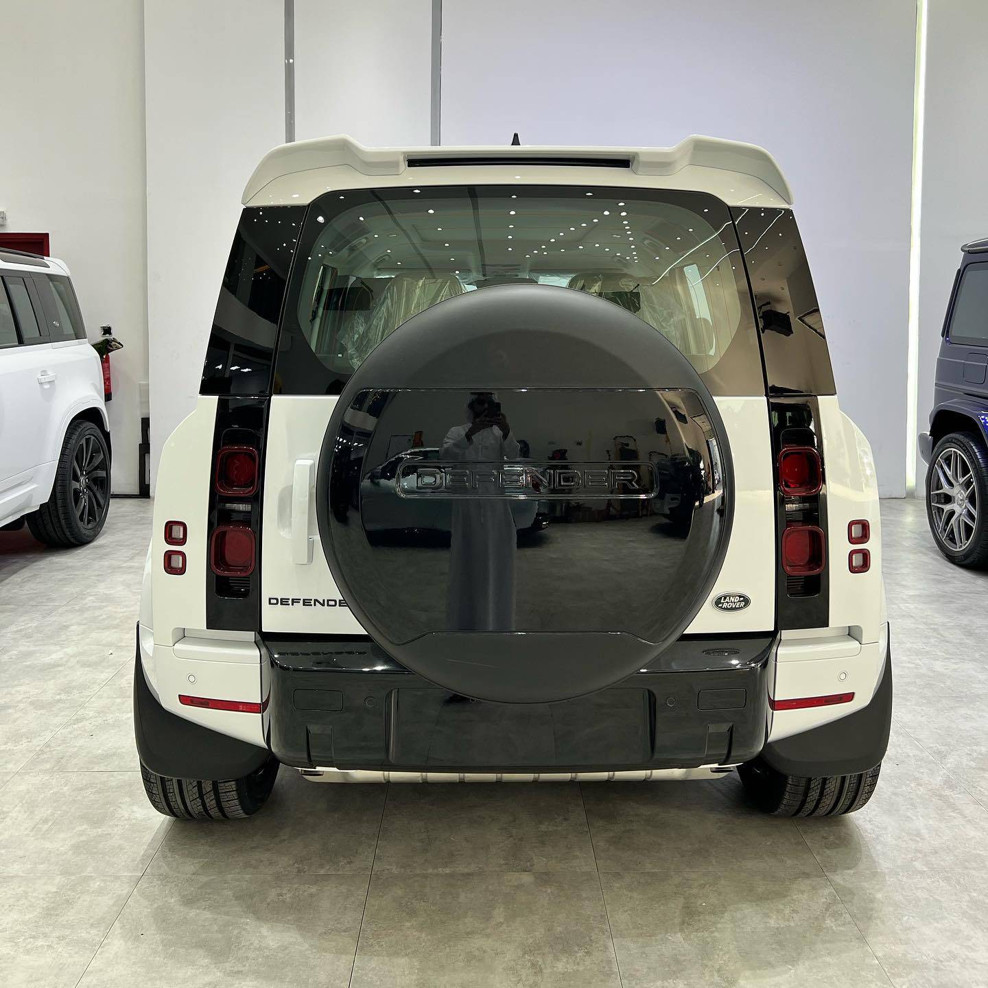 2023 Land Rover Defender 110 P300 White And Black, the smaller engine and power are indicated by the P300 logo. It has a tiny 2.0-litre turbocharged four-cylinder that produces 296 horsepower and 295 lb-ft of torque instead of a big six-cylinder (P400). For comparison, the P400 has +99 hp and 111 lb-ft less power. Although it is 221 kg lighter than the P400, it accelerates from 0 to 100 km/h in 7.4 seconds as opposed to the P400’s 6.1 seconds. But with a starting price of around $65,500, it is clearly an alternative to the BMW X5 and Audi Q7.