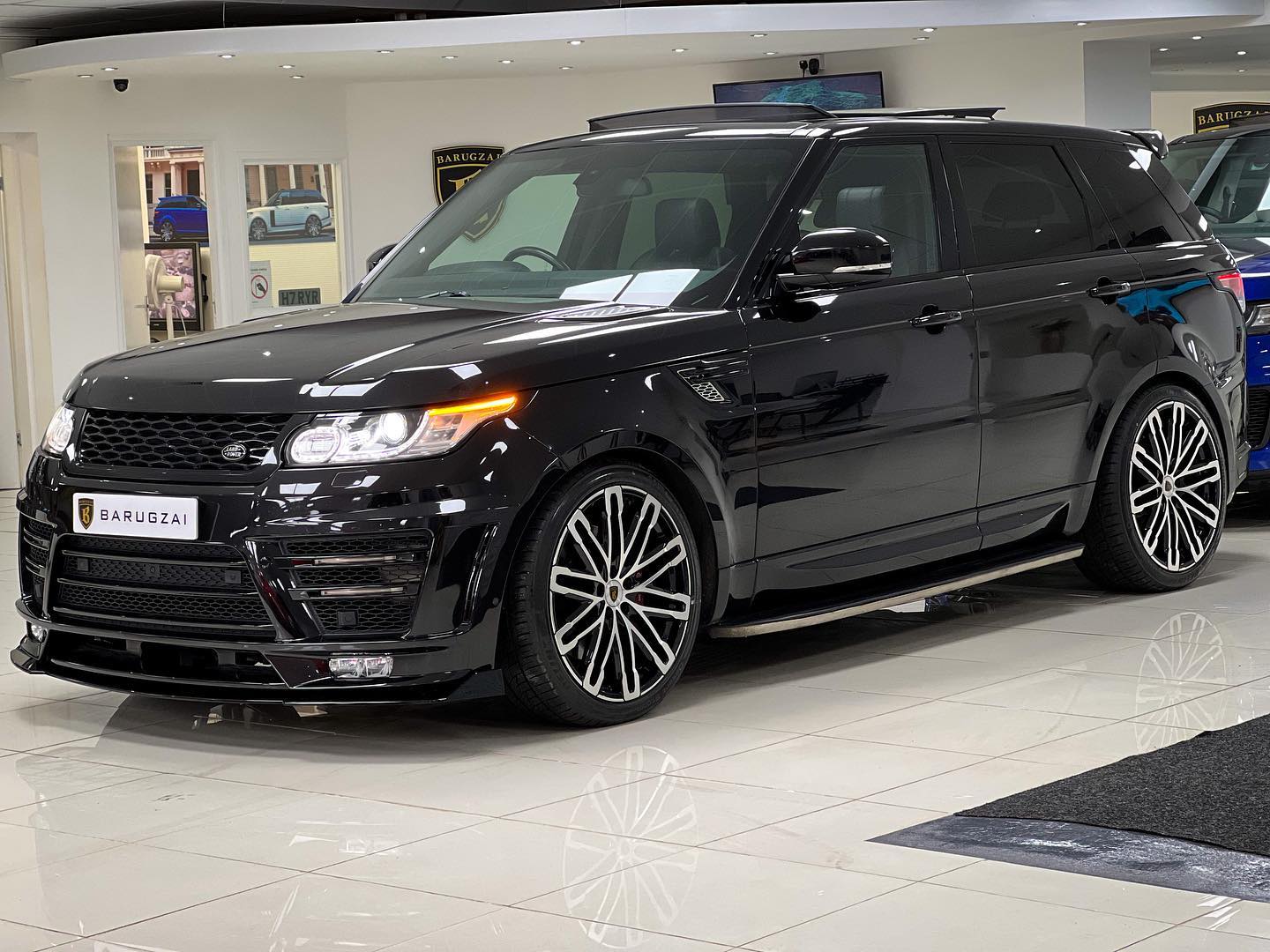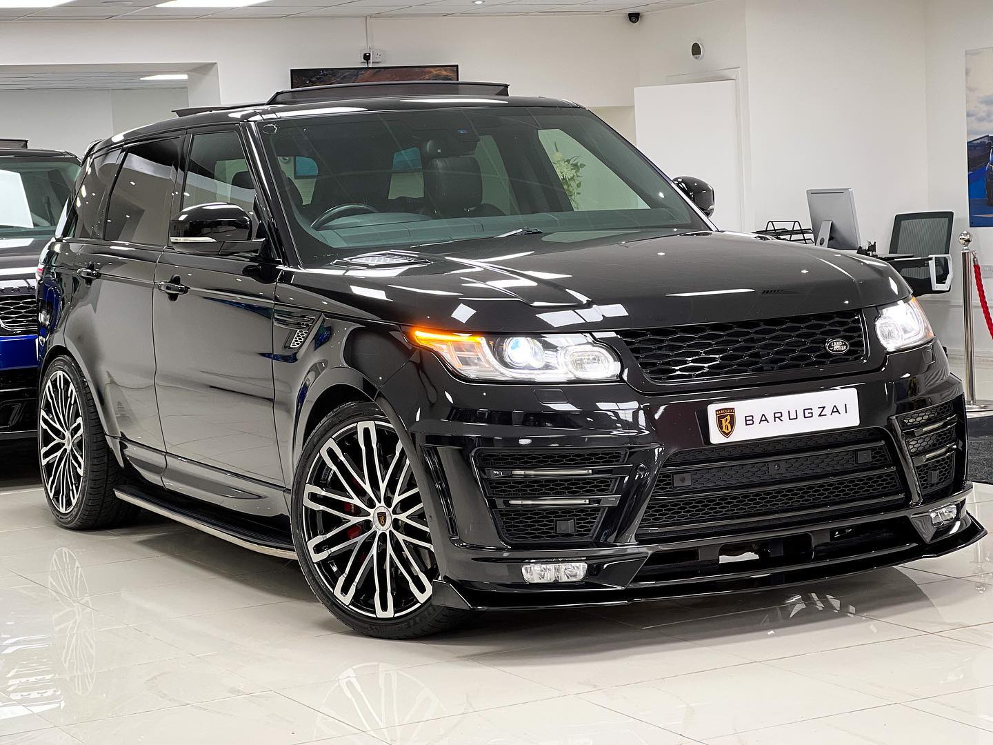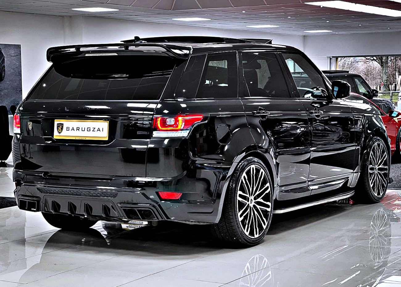 Range Rover Sport Barugzai Aero Edition. Finished in Santorini Black with Ebony Full Leather Interior, Contrasting Morzine Headlining & Sliding Panoramic Roof.